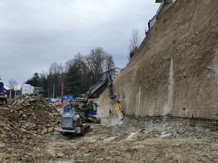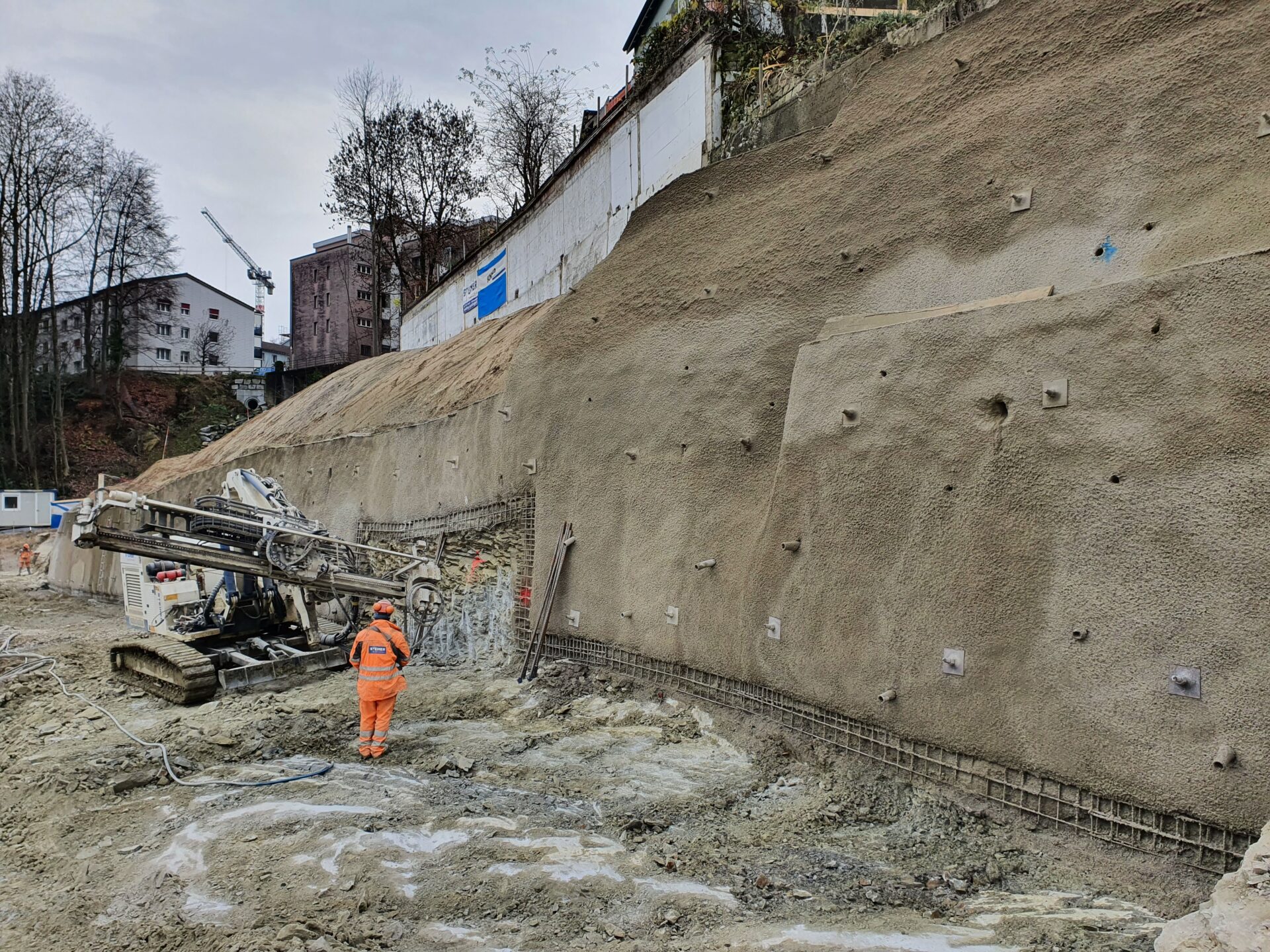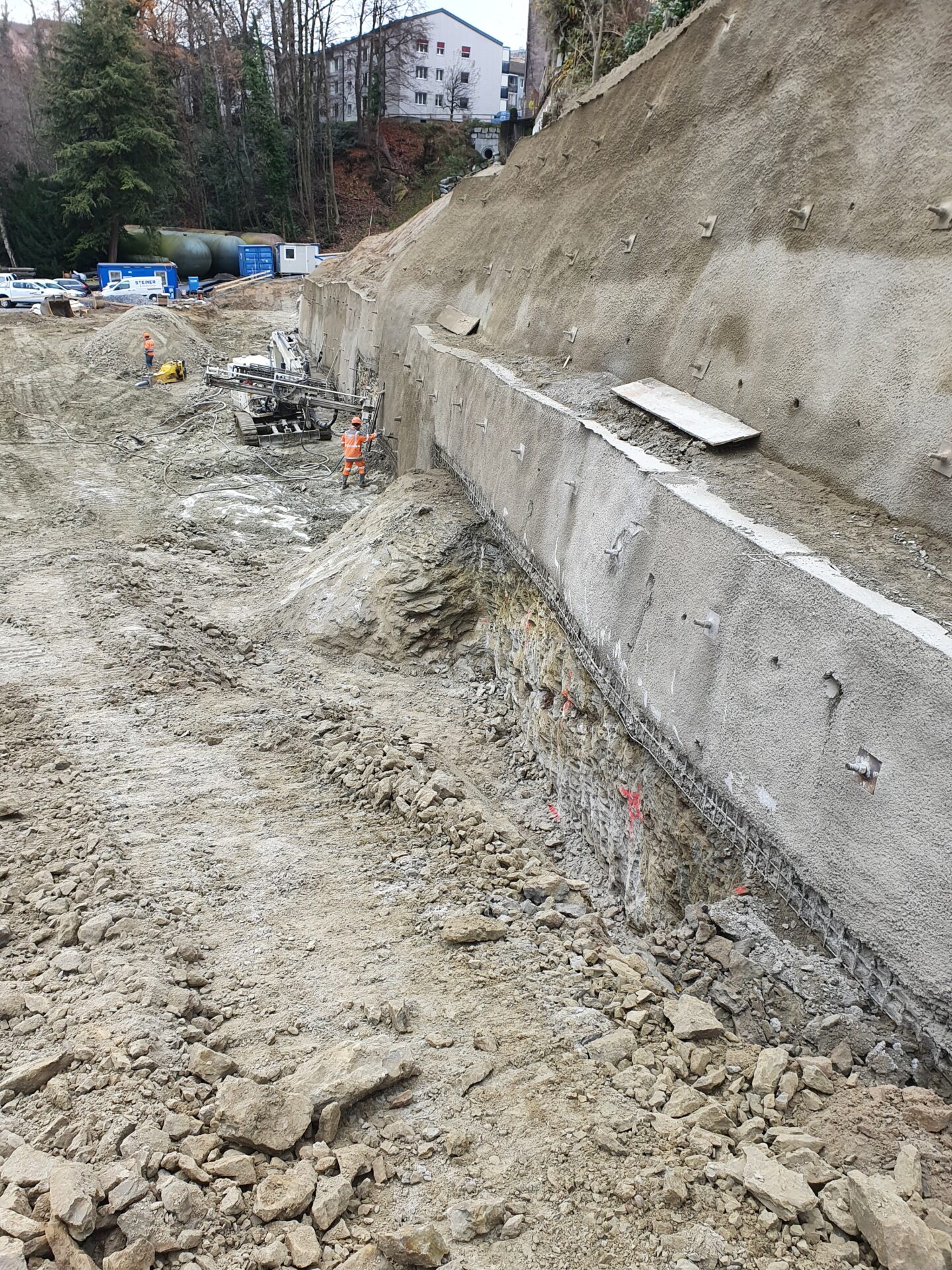 • Baugrubensicherung hangseitig mittels Spritzbeton und Systemvernagelung, strassenseitig mit einer abgespriessten Rühlwand